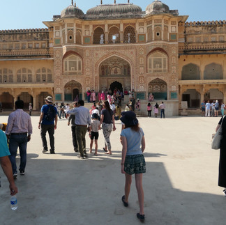 We hopped out of our car and said goodbye to our driver, then we walked along with our guide up to the gate. There were lots of people selling things but we just ignored, when we finally walked through the gate, we emerged into a huge court yard. There were actual elephants you could ride up the steep path easing to the courtyard. We walked through the court yard up some stairs and under a little shelter, the people there gave us some powder colour on our faces to celebrate the upcoming Holi festival.